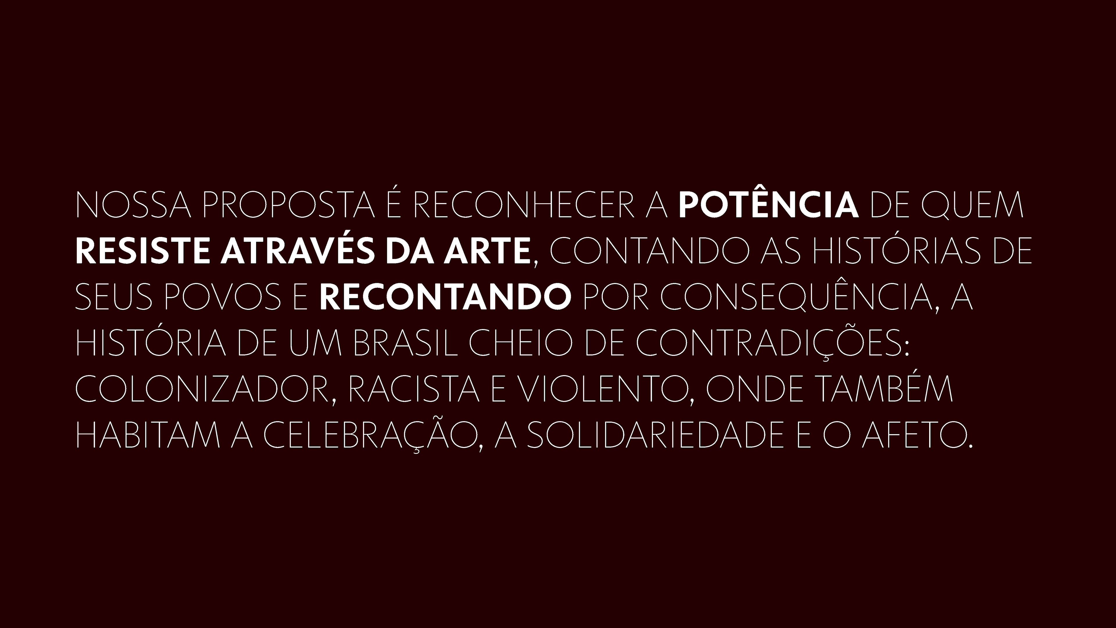 O conceito criativo para esse projeto partiu da pesquisa de artistas que resistem através da arte, e cujas obras têm centralidade na construção de novos imaginários. A proposta foi apresentar um espaço de diálogo entre passado, presente e futuro, onde a obra de Abdias do Nascimento, artista e pensador consagrado, encontra com a de Emerson Rocha, um jovem artista contemporâneo, traçando um arco histórico que desafia as estruturas impostas pelo racismo.